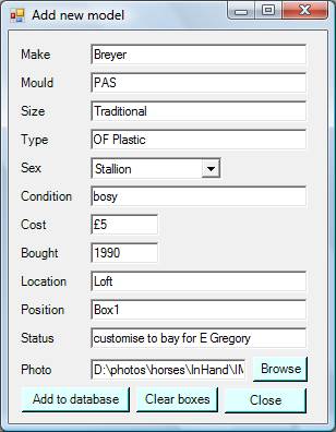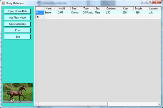 New bodies are added to the database using a separate form. If you want any columns removing or extra columns adding please ask. Changes to this database are usually free. The price for the Body Database alone is £5.00. Prices start from £10.00 for the Horse Details Database and one of the other databases, eg show, pedigree or photo databases. P&P is free to the UK. Free Demo SoftwareA free demo program is available that lets you run the full program but limits you to 5 models only. Please email me at the address below for a free CD or zip file of the demo. Any Questions?Please contact Celia at: sales@cmgsoftware.co.uk