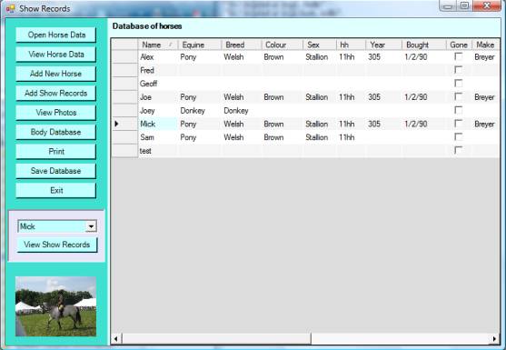 The version shown is the full software with all the options which includes the option to display the show records for a particular horse in the database window using a drop down list of names on the left hand side. You can add information and change things in the database directly in this window but changes will only be saved when you press ‘Save database’. The horse database can be sorted in any order by clicking on the column name. You can reverse the order by clicking it again. You can have many different horse databases. If you have a lot of models it may be easier to split them up by size, or make, or breed, etc. I am currently running one containing approximately 200 models with no problems. This is included with any software you buy. Basic printing is included. The database can also be copied and pasted into Microsoft Word, etc for more elaborate printing.