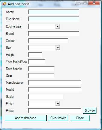 New horses are added to the database using a separate form. The file name is the name used from the horse's individual files and can be set to anything. It defaults to the name of the horse with any spaces removed. If you have the show records version which includes a points scheme any existing points totals can be added to the database, otherwise the right hand side does not appear. The minimum information you need to enter is ‘name’ and ‘file name’. Click ‘Add to database’ to store the information. The horse will now be displayed in the main menu data window. If you want any columns removing or extra columns adding please ask. Changes to this database are usually free. The Horse Details Database is included with all the model horse programs and can be bought alone. The price for the Horse Details Database alone is £5.00. Prices start from £10.00 for the Horse Details Database and one of the other databases, eg show, pedigree or photo databases. P&P is free to the UK. Free Demo SoftwareA free demo program is available that lets you run the full program but limits you to 5 models only. Please email me at the address below for a free CD or zip file of the demo. Any Questions?Please contact Celia at: sales@cmgsoftware.co.uk