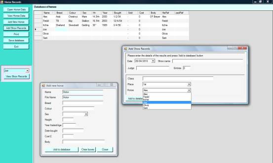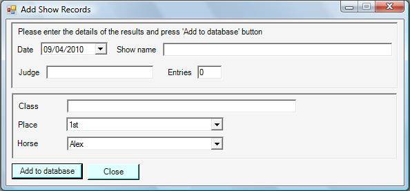Each horse has a separate show records file, which can be displayed in the main window and sorted in any order. When the show records are displayed in the main window they can be corrected or altered if you need to make any changes to them. The changes are saved using the 'Save Database' button which saves whichever database is open in the window at the time.